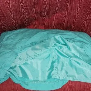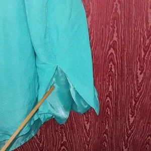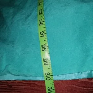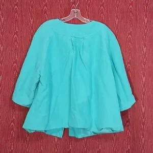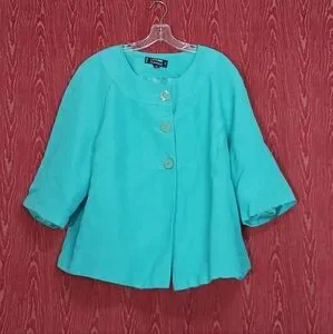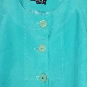 Stylish teal button-up jacket with matching skirt. Perfect for any occasion.