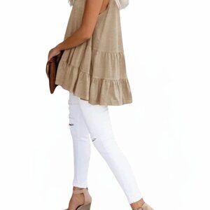 Elevate your wardrobe with this effortlessly stylish sleeveless tunic top! Featuring a relaxed fit, tiered ruffle design, and soft lightweight fabric, this top is perfect for casual outings, brunch dates, or layering with your favorite jacket. The neutral beige color pairs beautifully with jeans, leggings, or white pants for a fresh, chic look.