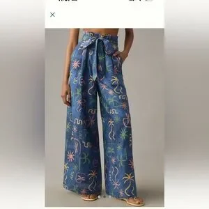 Stylish wide leg pants with colorful artistic designs. Features a chic tie waist.