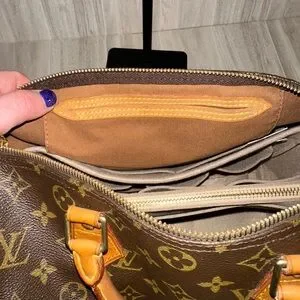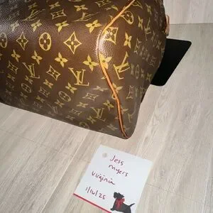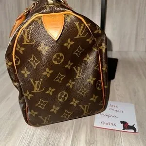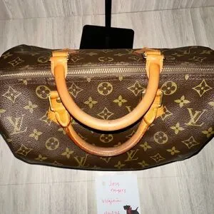 Classic Louis Vuitton monogram design. Elegant brown and tan leather accents. Perfect for any occasion.