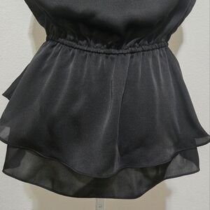 Elegant black semi-sheer sleeveless peplum blouse with ruffle details on the neckline with a split v. The drawstring waist creates a double ruffle on the bottom portion of the blouse. The waistline in back has an elastic stretch. The fabric has a shiny satin appearance.