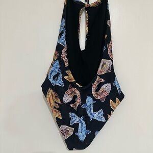 Make a splash with this chic black halter one-piece swimsuit, featuring a vibrant multicolor design. Perfect for a stylish beach day.