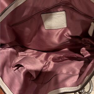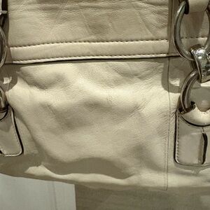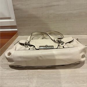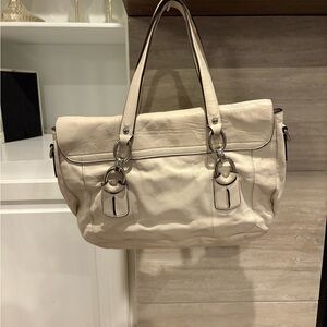 Elegant Coach shoulder bag in off-white. Features sleek silver hardware. Ideal for everyday style.