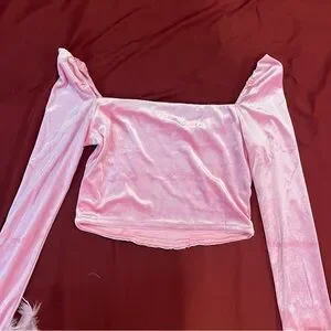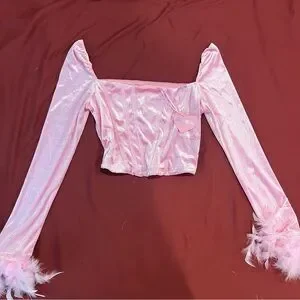 •Cuz you deserve the high life. This top has a stretchy velour construction, a square neckline, structured boning and long sleeves with marabou feather trim