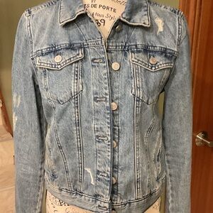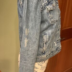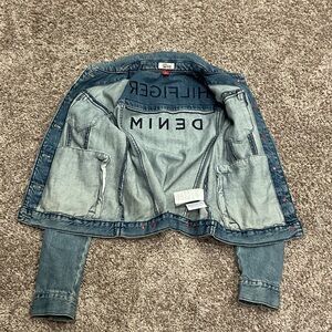 Classic light blue denim jacket. Features bold Hilfiger branding and flag detail on the back. It is a size small and is distressed. It features two inner pockets, as well as, two outer pockets. It is in excellent condition. The measurements are: sleeves 24 inches, bust 34 inches and the length is 20 inches from the top of the shoulders.