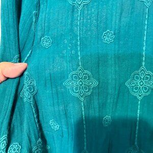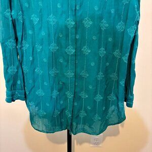 Chico's Cotton Blend Embroidered Teal Button Front Long Sleeve Tunic Top