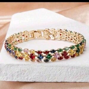 This stunning bracelet features a vibrant array of gemstones set in a luxurious gold band. Perfect for adding a touch of elegance to any outfit.