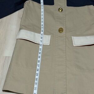 Elegant trench coat with navy sleeves and beige body. Features gold buttons and a white collar. Ideal for sophisticated style.