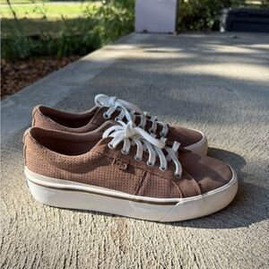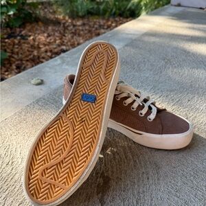 Barely used Keds low-top sneakers in a brown suede-like material with white laces.
