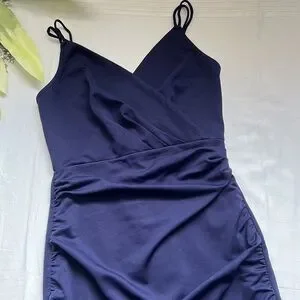 Features: Spaghetti straps; V-Neck; Ruched design; Hidden zip at back; Irregular wrap hem; Unlined