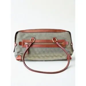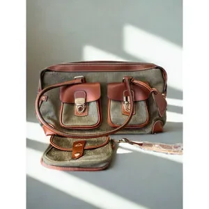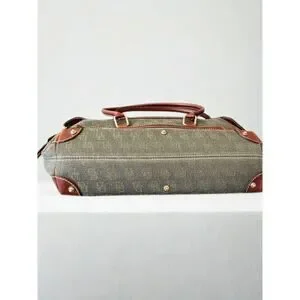 Rare and collectible Vintage Dooney & Bourke Double Pocket Tote (Style HP65C, Hunter Green). This piece features Dooney’s signature monogram canvas with Vacchetta leather trim and dual front buckle pockets — a functional and eye-catching design no longer in production.