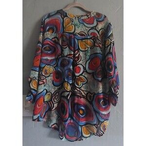 Womens size XL blouse from bantarsi, true 1990s style. Made of 100% polyester, it features a vibrant abstract multicolor print. Designed with 3/4 sleeves with button detail and a flattering high-low hem: 26 inches in the front and 28.5 inches in the back for a flowy, stylish look. Measures 20 inches from armpit to armpit. A bold and unique vintage piece perfect for retro fashion lovers.