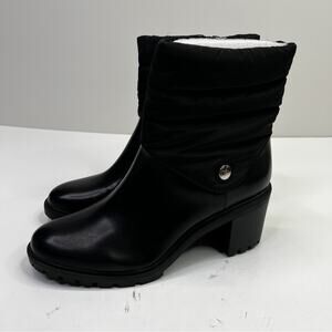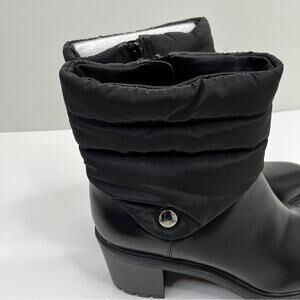 Black Belcalise ankle boots from Alfani. Quilted puffer design around the ankle with a faux leather upper. Chunky rubber lug sole is rugged and weather ready. 3" block heel. Almond shaped toe with an inner ankle zipper for easy on and off. Cushioned insoles for added comfort. New in box - retail $110.