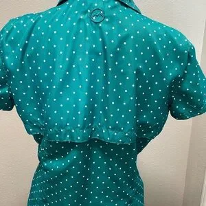 Stylish teal button down shirt. Features white polka dots. Short sleeves. Perfect for casual outings.