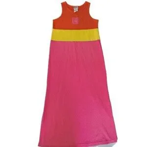 The Delicates Spa Y2K Maxi Dress is a stylish and vibrant outfit perfect for summer occasions. This sleeveless dress features a round neckline and a pullover closure, making it easy to slip on for a party, travel, or casual outing. The dress has a long length and is made of knit fabric, offering comfort and stretch. The colorblock design adds a trendy touch, while the sun accents and sun pocket detail give it a whimsical and fun vibe. Perfect for a boho or tropical-themed event, this vintage-inspired dress is sure to make a statement.