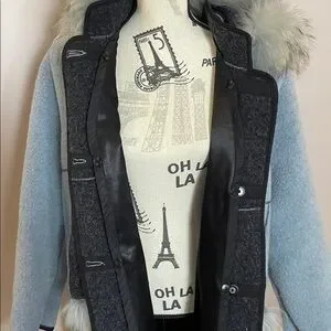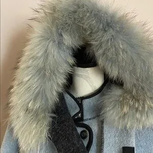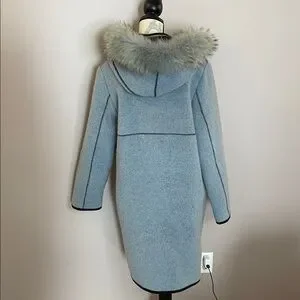 ✨ Elegant & cozy powder blue coat featuring a luxurious fur trim and attached scarf with matching fur details. Designed with a removable inner vest and detachable hood for extra warmth & versatility.