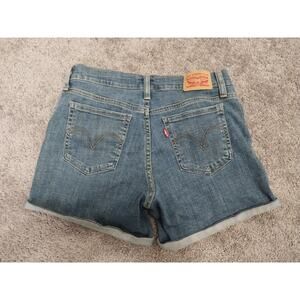 The product is a pair of Levi Strauss & Co women's size 28 mid-length stretch denim shorts in a medium wash finish. These shorts feature a button closure and a flat front design, making them suitable for casual or travel occasions. Made from a cotton blend fabric with added stretch, they are comfortable for activities like walking, beach outings, or school during the summer, fall, or spring seasons. The medium wash color and cut-off style give them a versatile and trendy look that can be dressed up or down for various summer activities.