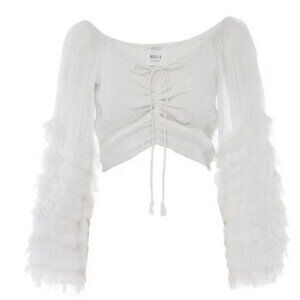 The signature petal ties decorate the smocked bodice and allow the option for an adjustable cinch while the sheer bishop sleeves are adorned with layers of fringe