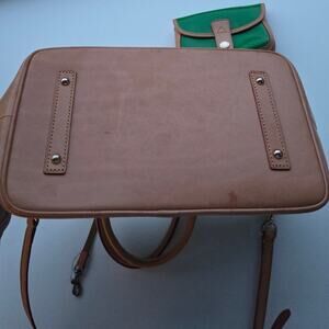 very minor wear - please see pictures for some minor wear on tan leather. small paint transfer/ink stain on a coin purse. no color transfer on a patent leather on the bag itself.
