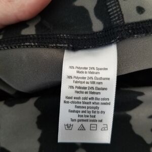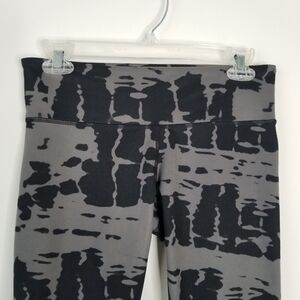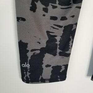 Gently used Alo Yoga High Waist Airbrush Capri Leggings in a size Small. Color is black and gray tie dye print.
