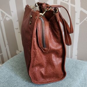 Soft, genuine leather tote with so many compartments for organizing your essentials. The leather is tooled / embossed making each piece unique. Its stylish design and durable material make it a must-have accessory.