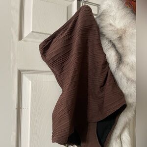 Gottex one piece dark brown ruched strapless swim suit. Padded cups. Size 6.