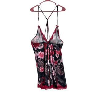 Key Features: Adjustable strappy back, sheer floral print, red lace trim, stretch satin feel
