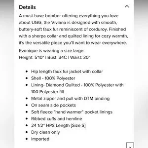 A must-have bomber offering everything you love about UGG, the Viviana is designed with smooth, buttery-soft faux fur reminiscent of corduroy. Finished with a sherpa collar and quilted lining for cozy warmth, it's the versatile piece you'll want to wear everywhere.