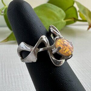 This modernist sterling silver opal ring by Uncas has a bold setting and fiery gemstone. The ring is a size 5 1/2, making it ideal as a pinky ring or for smaller hands.