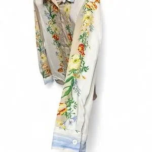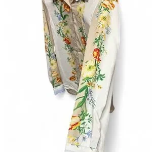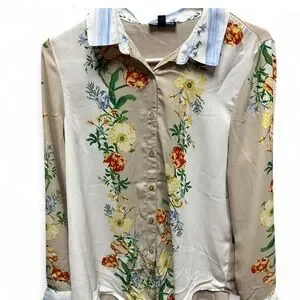 Elegant blouse with colorful floral design. Features a soft beige and white base.
