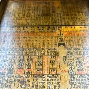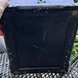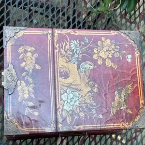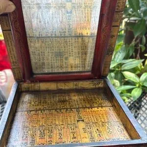Beautiful vintage wooden jewelry box with intricate brass accents. Features a rich red color with decorative floral designs. Has some cracking to the lacquered finish and a couple of chips. See pics. The top lifts up and a mirror slides up. It is lined with Chinese book pages that are also lacquered. 8.5" wide, 10.75" deep, 6.5" tall.