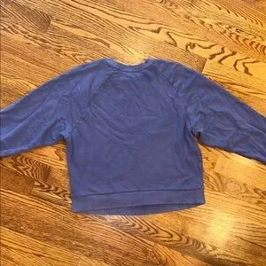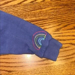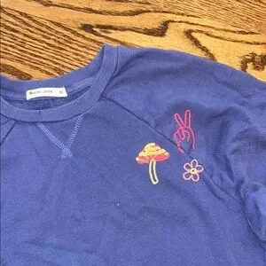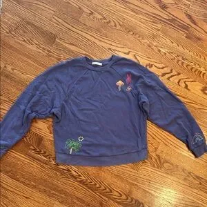 Cozy blue distressed sweatshirt featuring colorful embroidered designs including a mushroom, flower, rainbow and palm tree. Cropped. Size XS