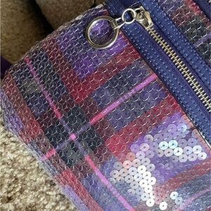 Eye-catching crossbody with plaid pattern and sequins. Perfect for a bold style statement.