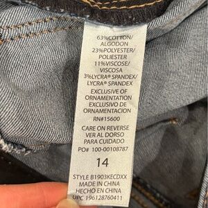 Democracy "Ab"solution Blue Boot Cut/Flair Jeans, size 14. Used but in great condition. 30” inseam, 40.5” long, and 35” waist. The abs technology waist band is built in the inside, as seen in the close-up zipper & button up waist photo. Comfortable jeans with stretch and a slight flair/boot cut, machine wash cold inside out. Made of cotton, polyester, viscose, and Lycra. Great length for our tall ladies!