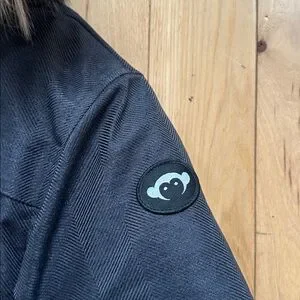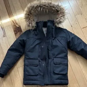 Cozy warm jacket by Appaman. Very gently used like new!! very stylish with faux fur hood and herringbone design classy deep gray color.