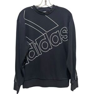 Adidas Originals crewneck sweatshirt in black with a bold oversized white outlined Adidas logo across the front. Classic sporty style with long sleeves, ribbed cuffs and hem, and soft cotton-blend fabric. Perfect for casual wear, lounging, or pairing with joggers and jeans.