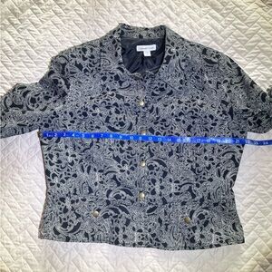 Coldwater Creek Black/White Paisley-style Pattern Cotton Jacket Size 14. Vintage. Lined. Small peplum styling with snap detail on front, faux pockets and sleeves. Classic style for office or casual with jeans. Excellent condition.