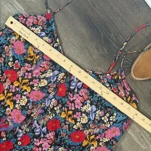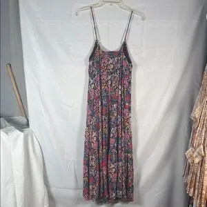 Vibrant floral maxi dress with spaghetti straps. Features a colorful floral pattern.