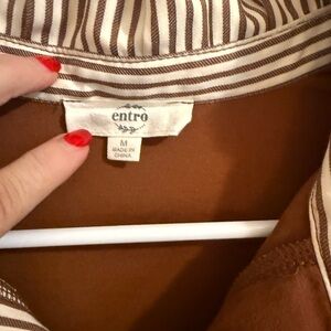 Chic brown top with a stylish striped collar. Ideal for everyday wear. Material is so comfy! Size medium with room.