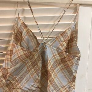 Chic plaid camisole with delicate spaghetti straps. Features a button-down front. Great for the coming season. Can be layered under sweaters for a chic fall look. Worn maybe 1x.