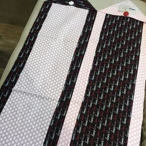 Brand new. Hand crafted from all new 100% cotton fabrics. This is a set of 2 runners. One features pink hearts framed in “love” print on black fabric and measures approx. 8 1/2” x 41 1/2”. The second runner is the reverse, “love” print framed by pink hearts and measures approx. 8 1/2” x 41”. Both were made in a smoke free home.