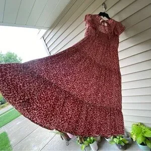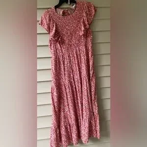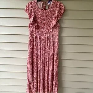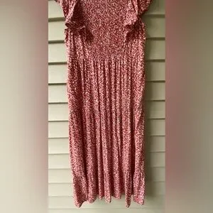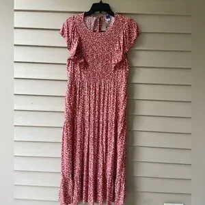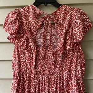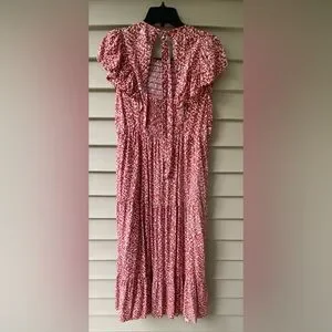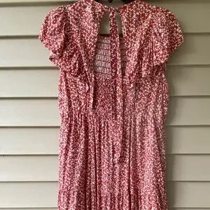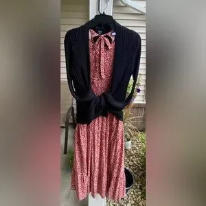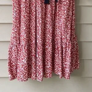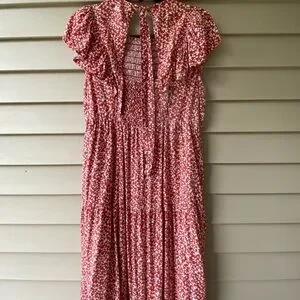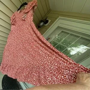 Elegant, layered Midi dress with a red background and a white floral pattern. No pockets but it does have a cute tie in the back at your neck, and it is in great pre-loved condition. Perfect for casual outings, perfect with a sweater over it at night, or to wear into this upcoming fall weather.