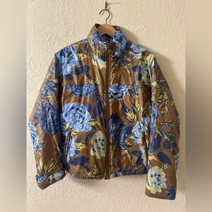 Chic puffer women's jacket featuring a vibrant floral design. Perfect for adding a pop of color to your wardrobe. Great for snow, skiing, ice skating