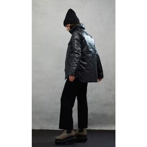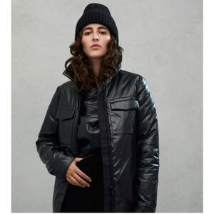 Teatherless Bomber Black Neat peaked face framing collar. Smooth satin shell finished in lightweight recycled polyester. Ultimate lightweight bomber jacket.
