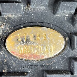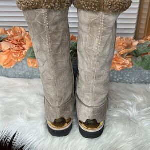 Cool gold finished metal plates at heels of these Stuart Weitzman Womens Winter Boots Beige Crocodile Embossed Faux Shearling