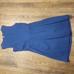 sleeveless, knee-length blue dress with a fitted bodice and a flared skirt. The dress features a round neckline and pleats on the skirt, giving it a structured yet flowy appearance. J.Crew, in size 2XS, and made in Vietnam. The dress also has a back zipper closure with hook-and-eye fastenings at the top. The material appears to be a thicker, structured fabric, possibly a blend of polyester, rayon, or similar materials.