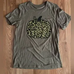 Brown and black cheetah print pumpkin tee. Tee shirt is sage green. Size is medium. Smoke and pet free home