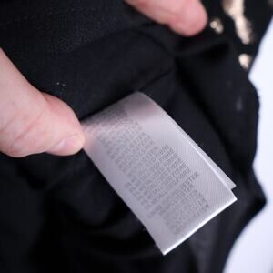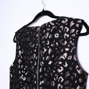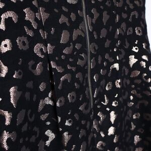 Black with rose gold leopard print in metallic foil accents, this dress is fully lined, panels that aid in slimming and shaping. Has deep side pockets and an exposed back zipper. Perfect for evening events, this mini dress adds a touch of glamour to any occasion.