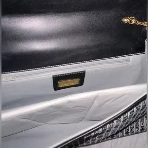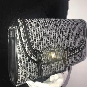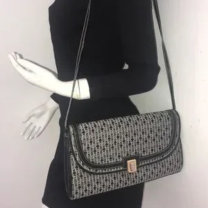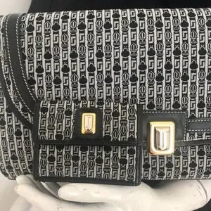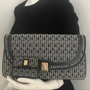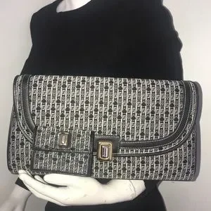Handbag only - New vintage Judith Leiber jaquered monogram fabric in darkest grey and off white. Gold and silver JL clasp.