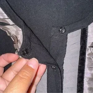 This CAbi cardigan offers a sophisticated style with its black knit and unique fringe details. Ideal for adding a touch of elegance to your wardrobe.
